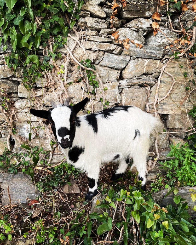In addition to the chickens and geese, we have two cute black and white dwarf goats, who love brambles and weeds, so they help us with the clean-up job!
